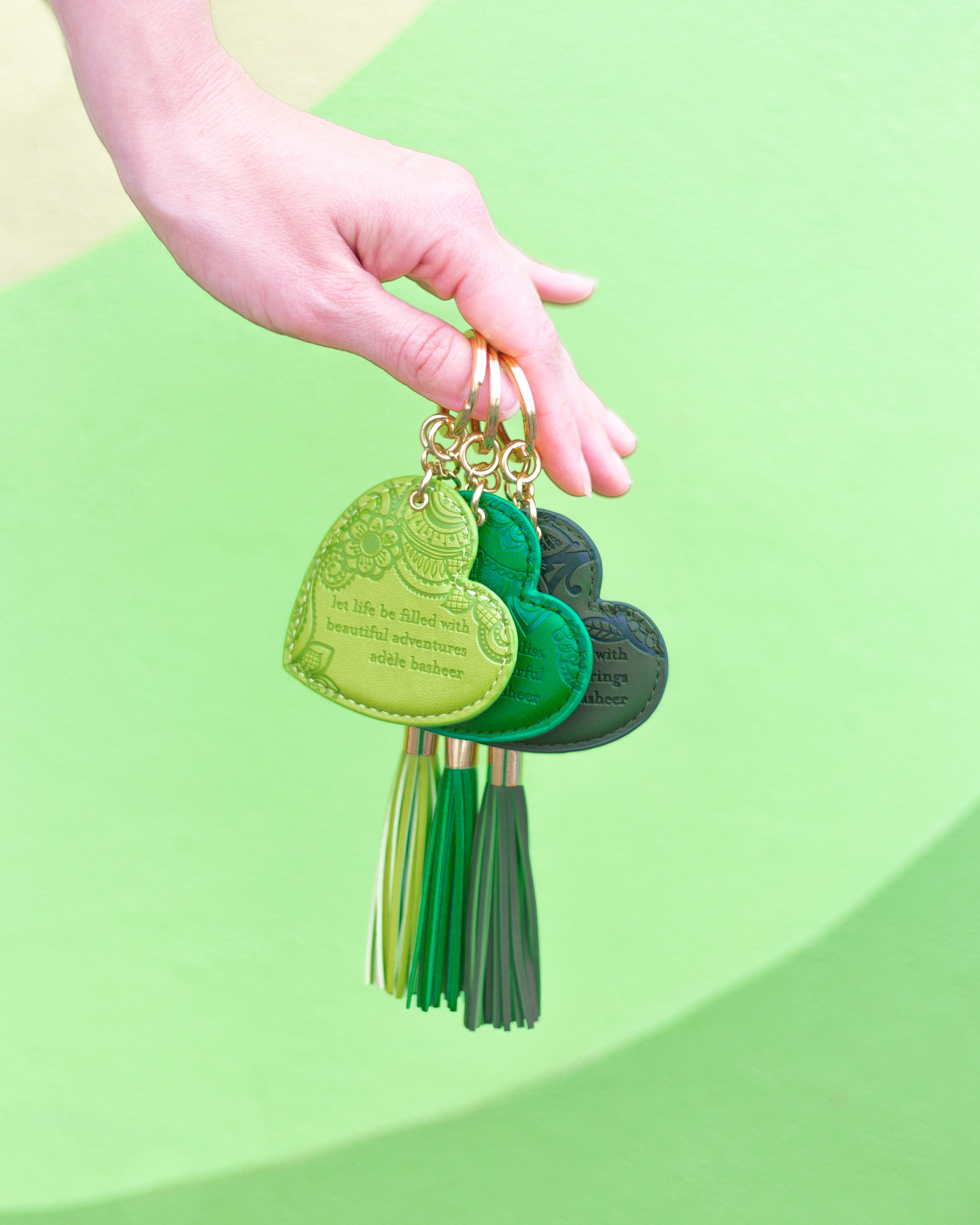 This heart-shaped, vegan leather keyring features a cute tassel and positive words inspiring you to fill your days with happy wanderings.