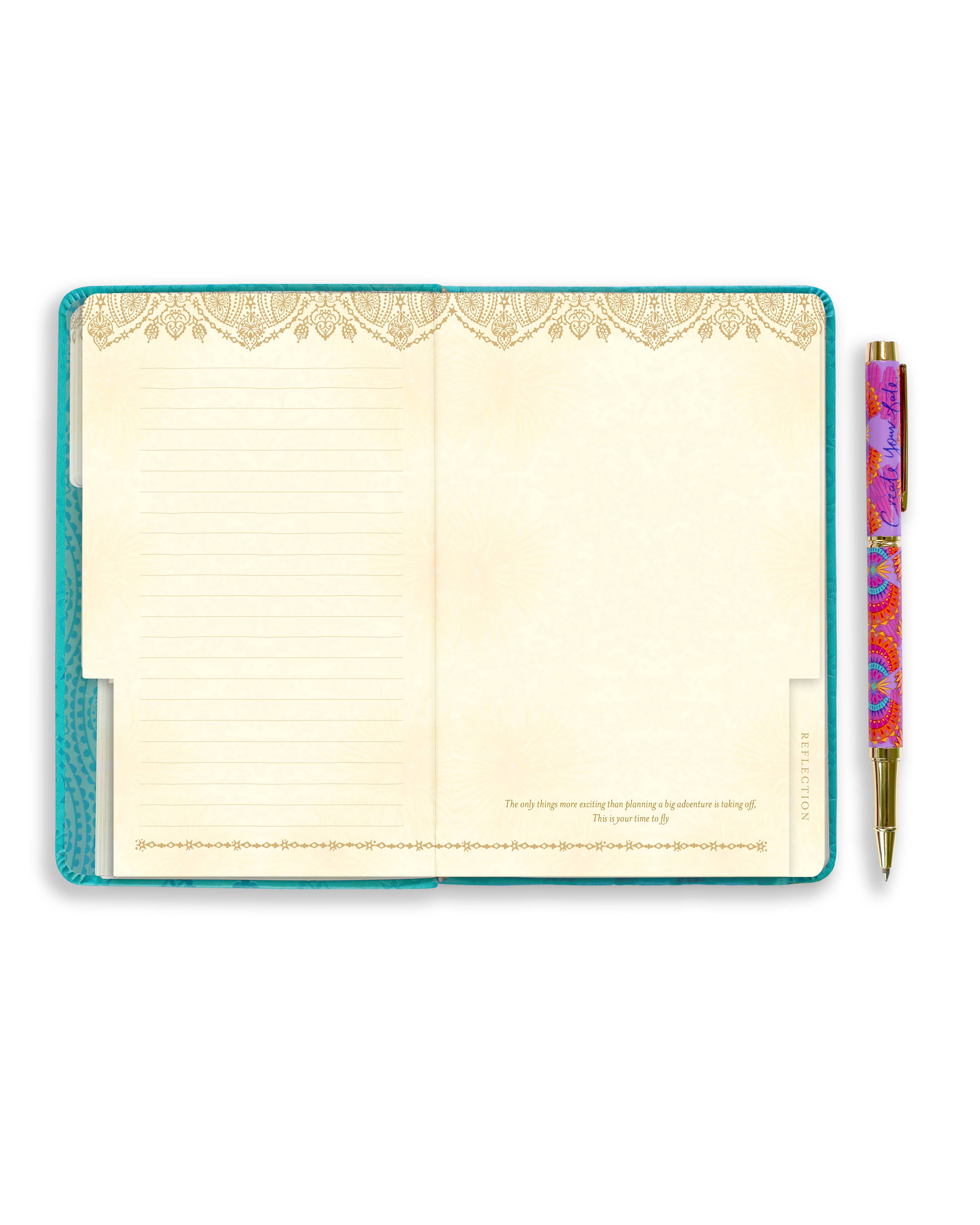 Travellers will be inspired to write and capture their memories in the beautifully embossed, boho-style aqua journal graced with an Adèle Basheer quote.