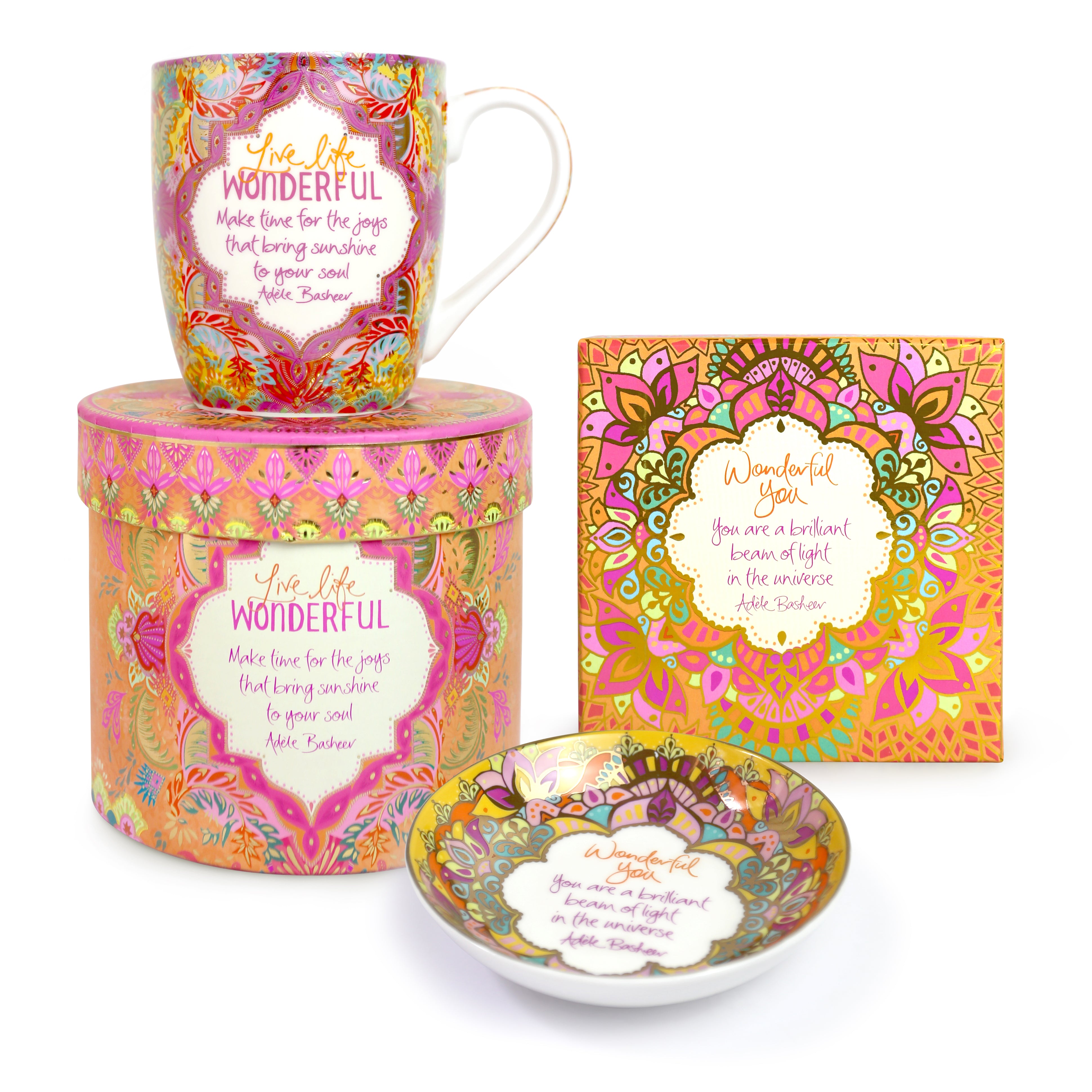 Inspire yourself or your loved one to live life wonderful with this bright + cheerful gift set... perfect for adding a boost of happiness to their day to remind them how wonderful they are.